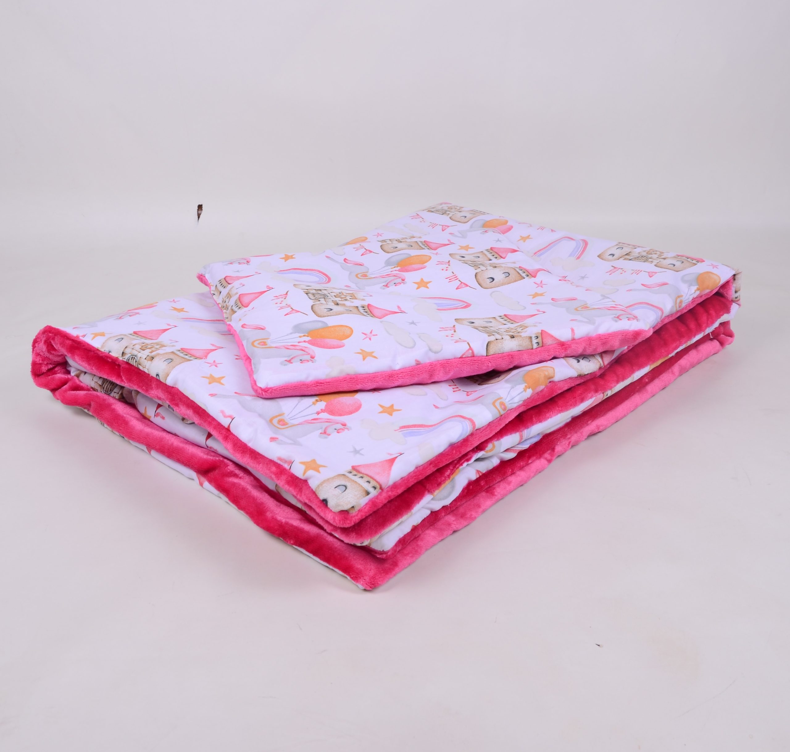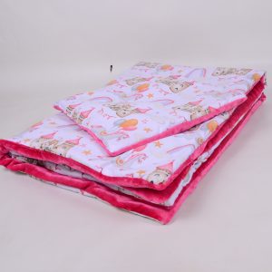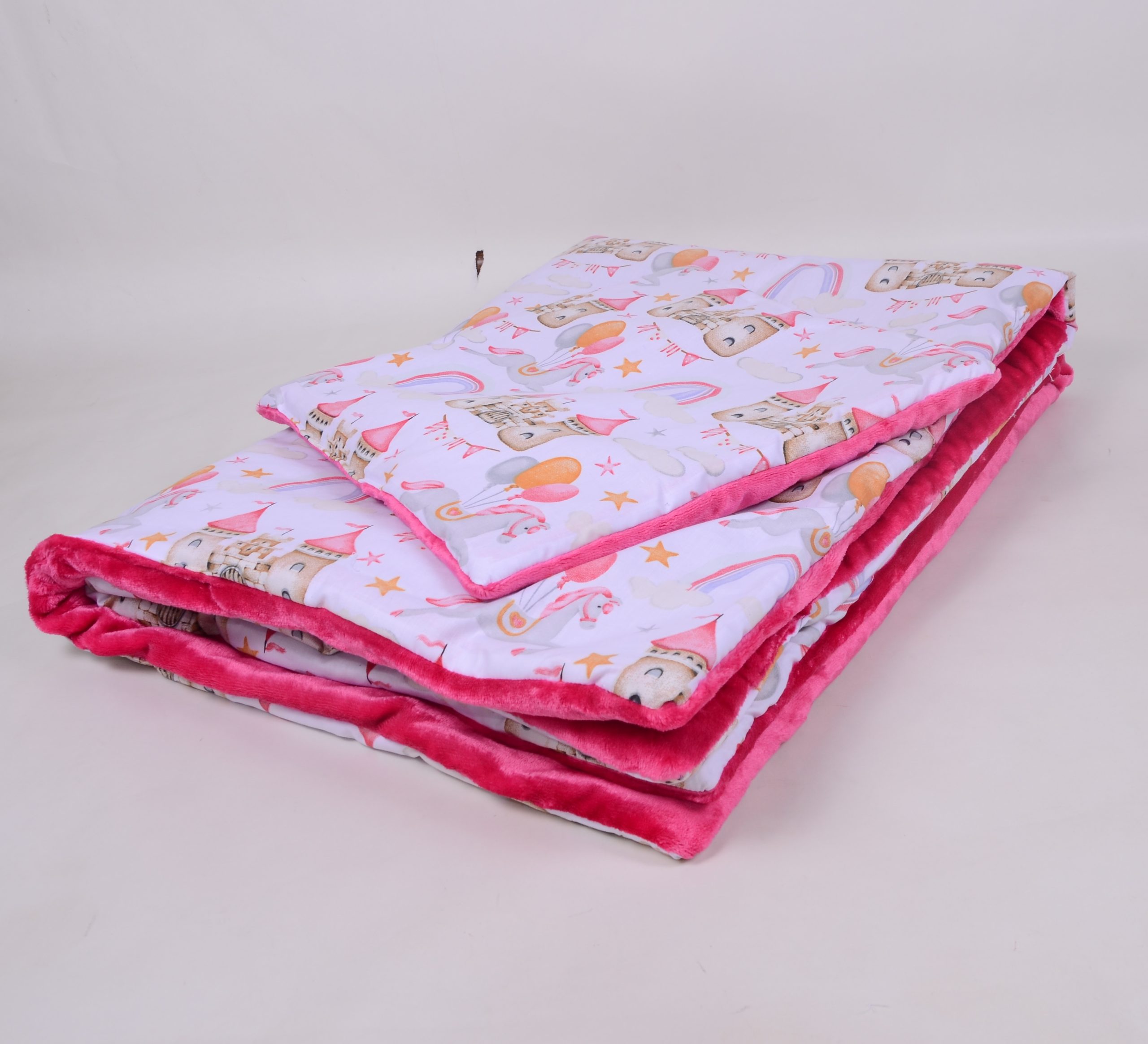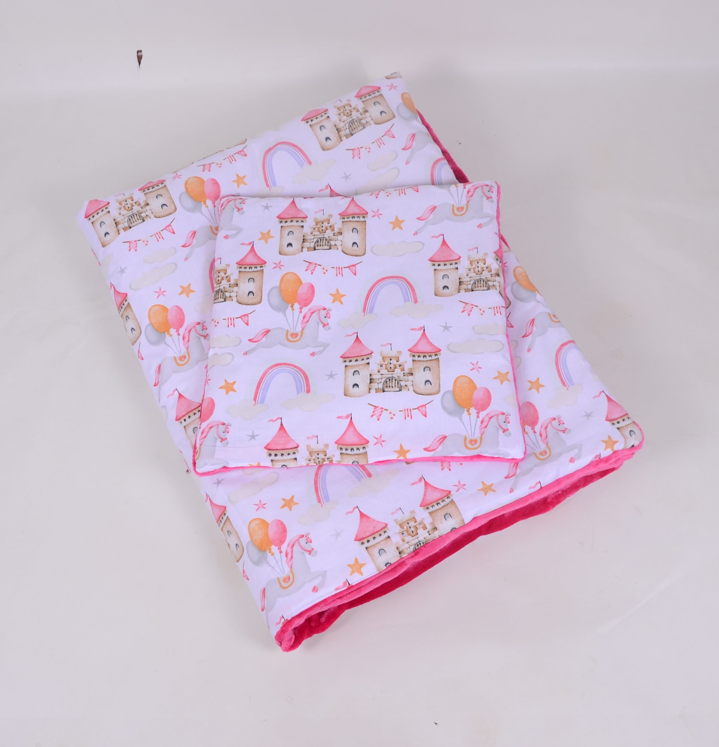 A takaró egy oldal mintás pamutvászon, egy oldal puha minky/softtal és egy vlies béléssel készülnek. A 3 réteget összevarrjuk, így a bélés nem fog csúszkálni. A párna ugyanúgy készül, mint a takaró.