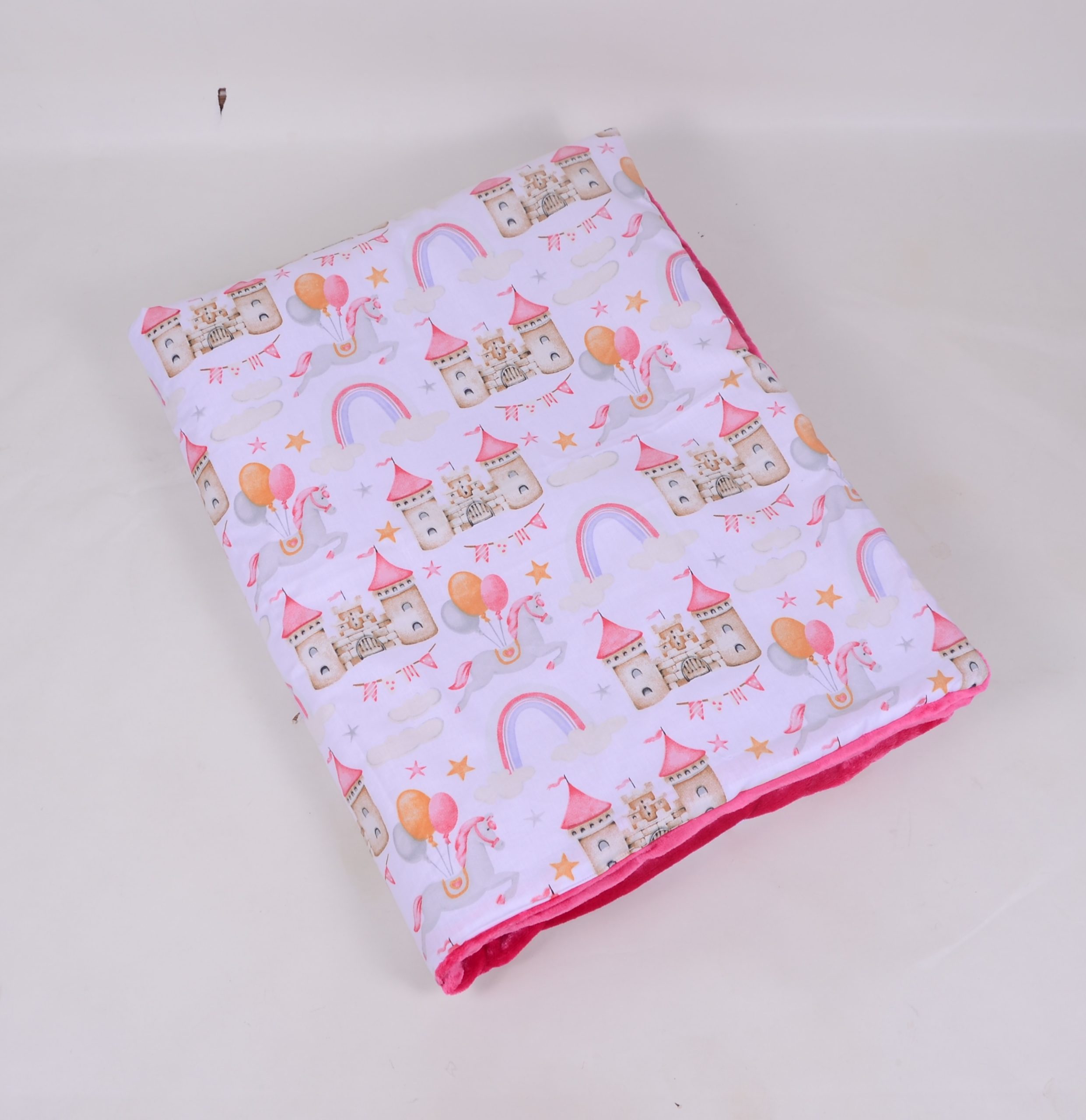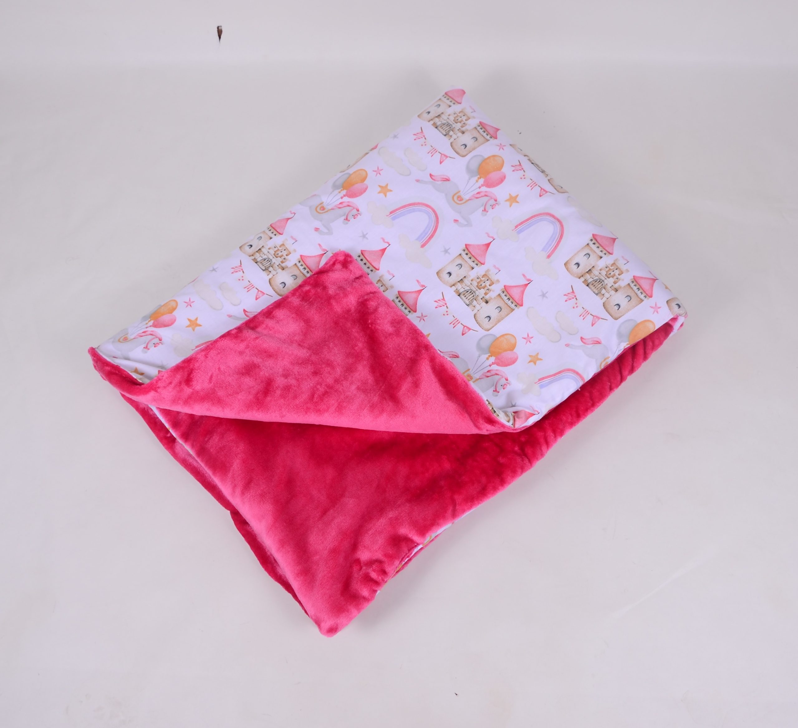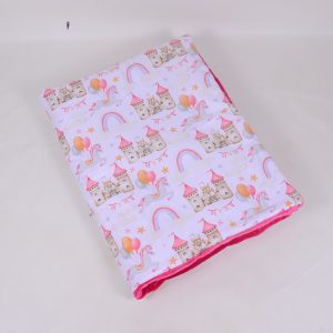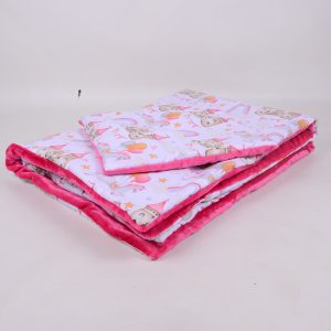 A takaró egy oldal mintás pamutvászon, egy oldal puha minky/softtal és egy vlies béléssel készülnek. A 3 réteget összevarrjuk, így a bélés nem fog csúszkálni. A párna ugyanúgy készül, mint a takaró.
