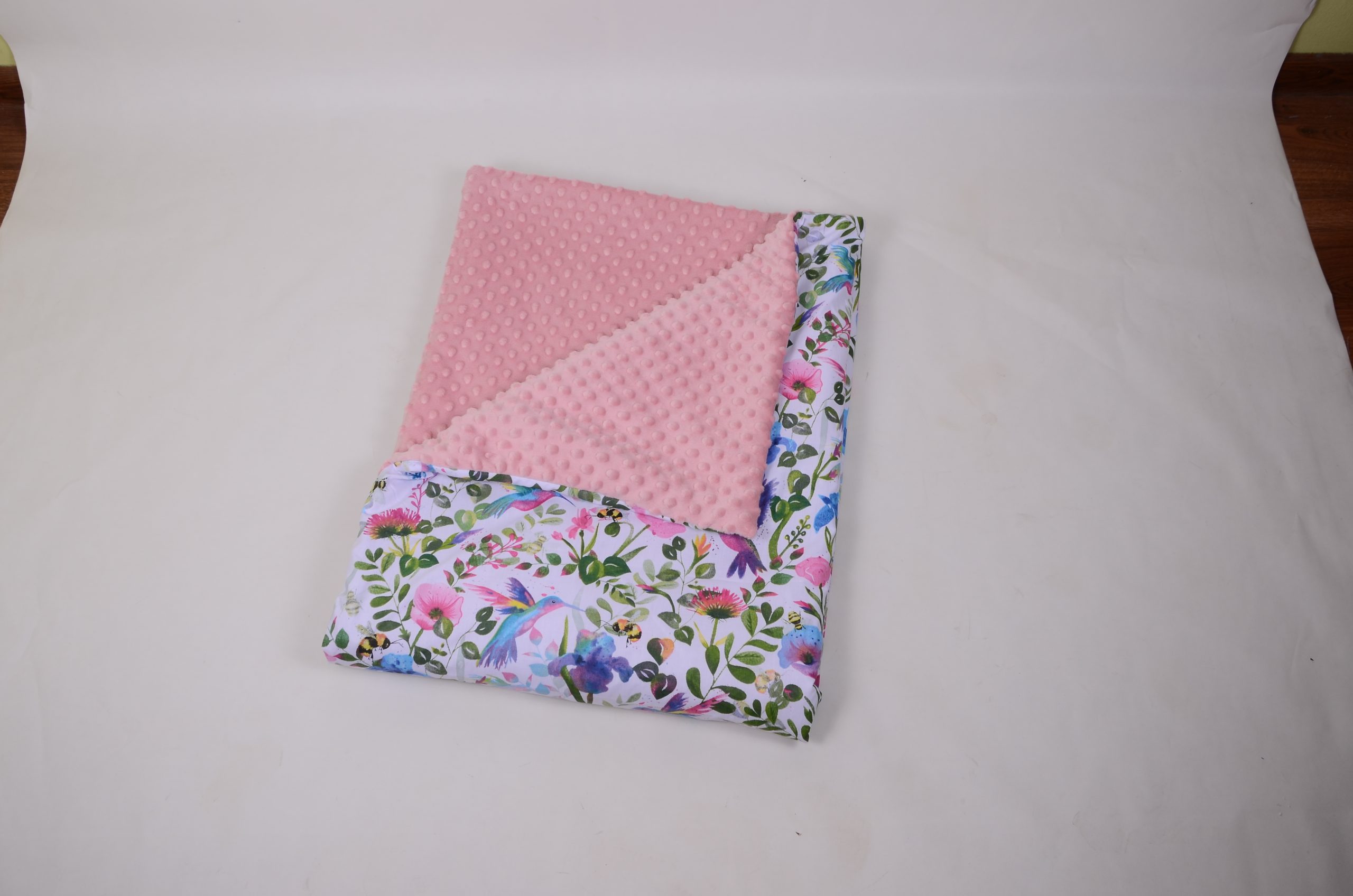 A takaró egy oldal mintás pamutvászon, egy oldal puha minky/softtal és egy vlies béléssel készülnek. A 3 réteget összevarrjuk, így a bélés nem fog csúszkálni. A párna ugyanúgy készül, mint a takaró.