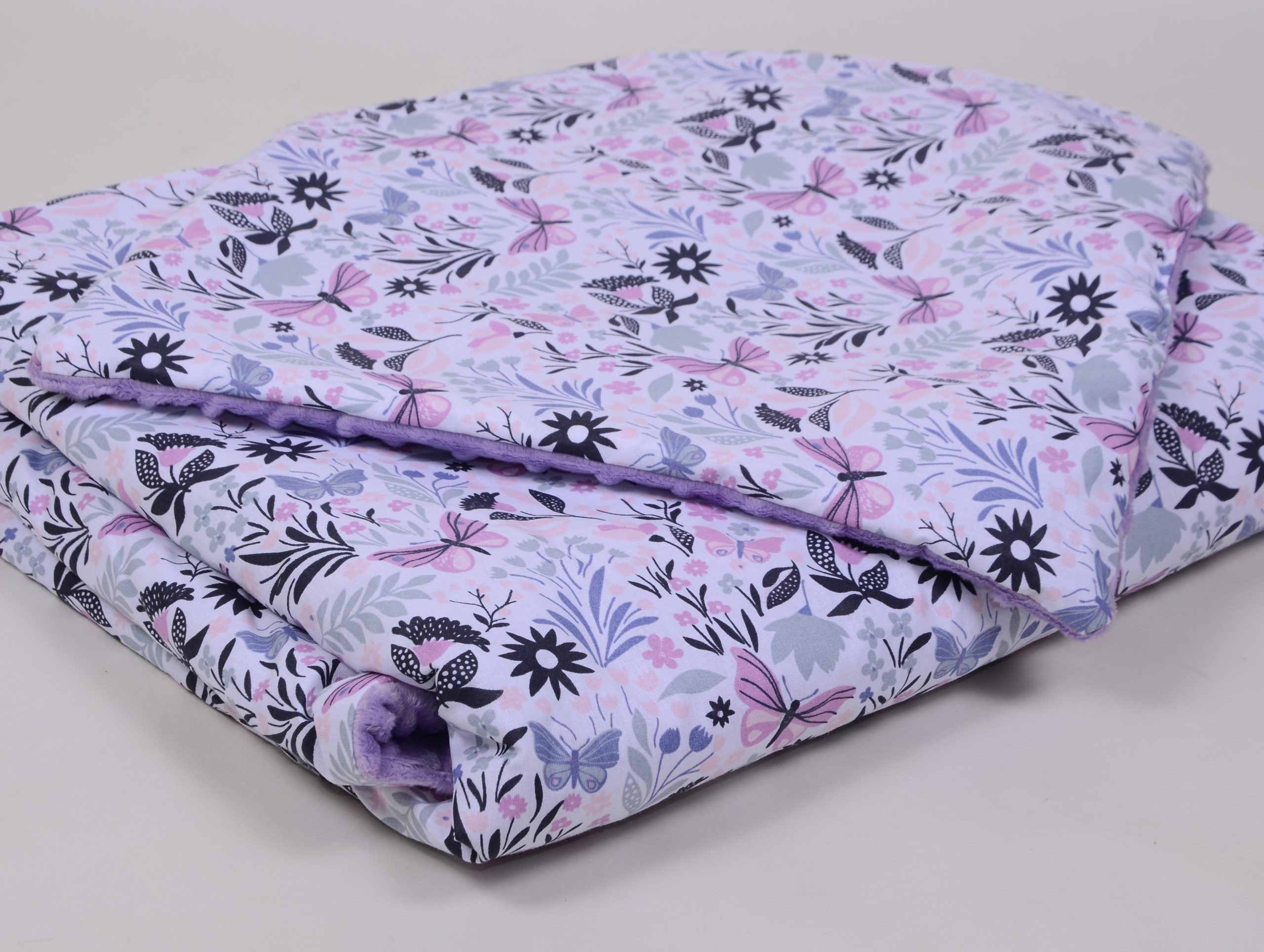 A takaró egy oldal mintás pamutvászon, egy oldal puha minky és egy vlies béléssel készülnek. A párna ugyanúgy készül, mint a takaró. A 3 réteget összevarrjuk, így a bélés nem fog csúszkálni.
