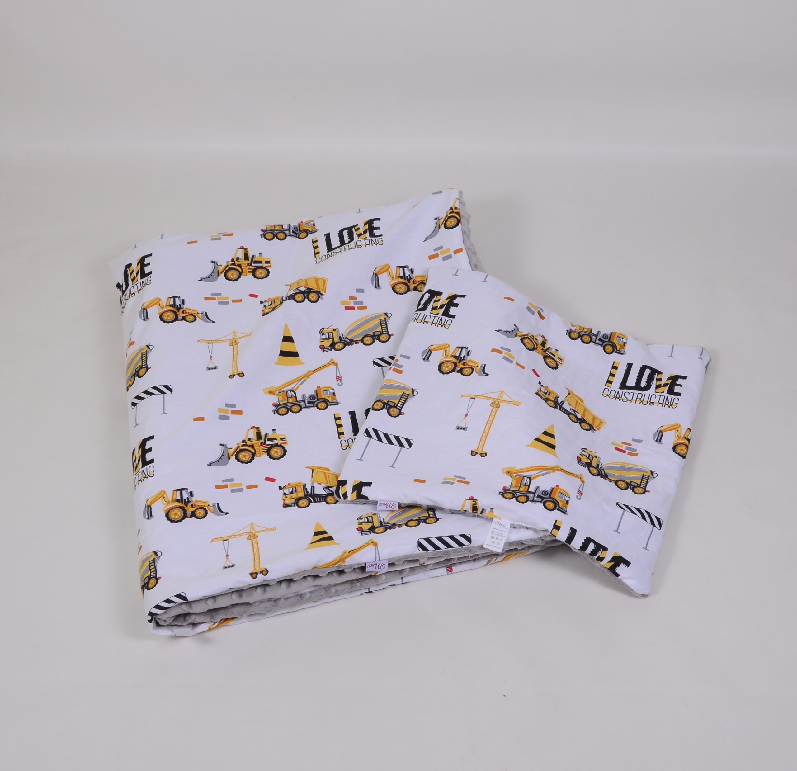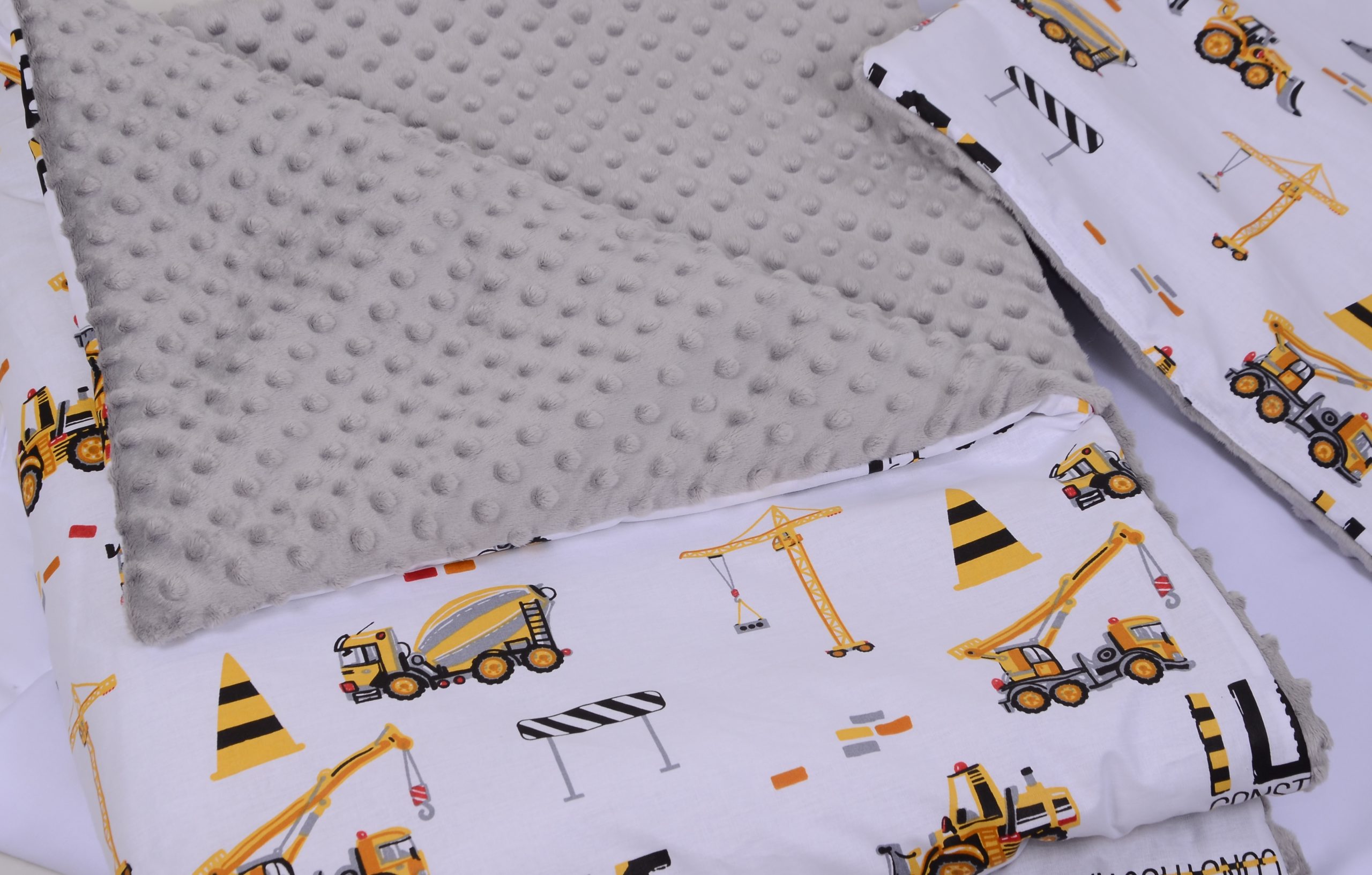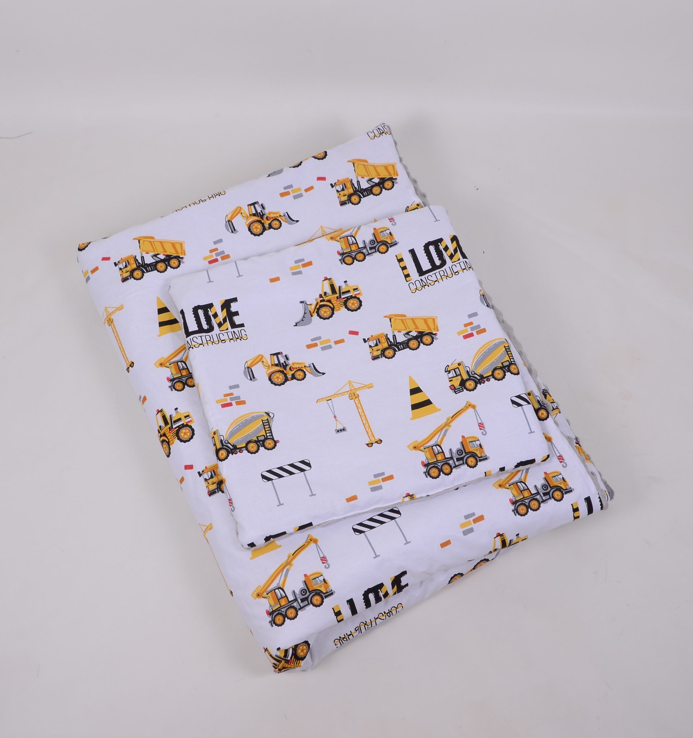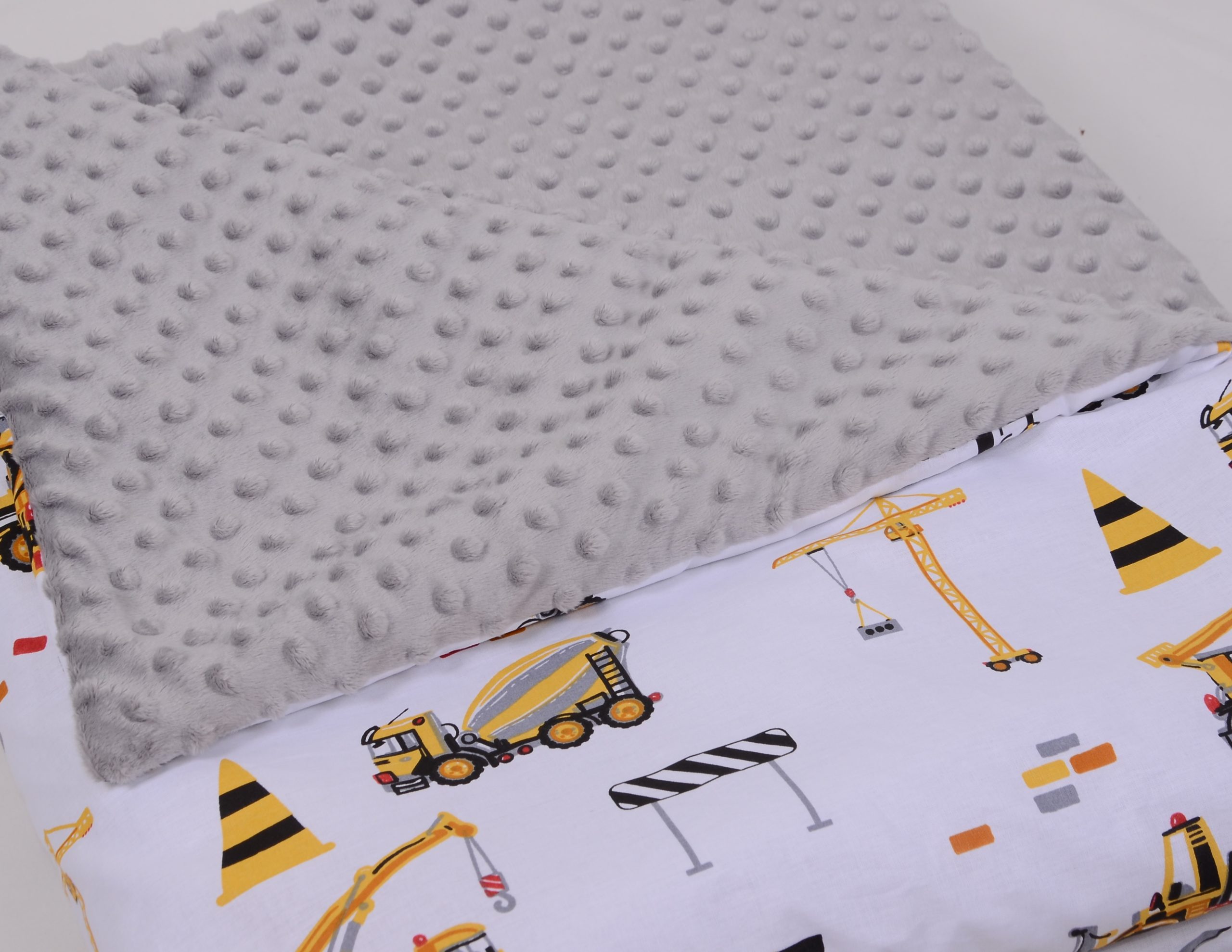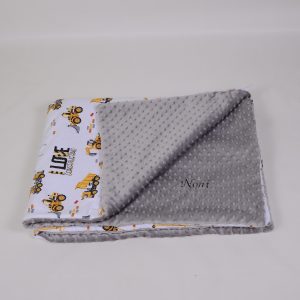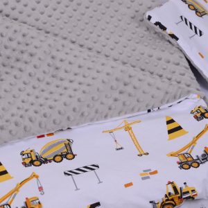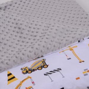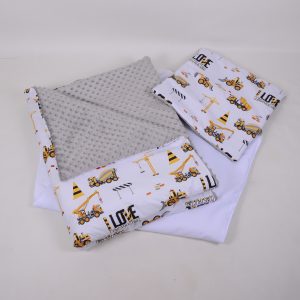 A takaró egy oldal mintás pamutvászon, egy oldal puha minky/softtal és egy vlies béléssel készülnek. A 3 réteget összevarrjuk, így a bélés nem fog csúszkálni. A párna ugyanúgy készül, mint a takaró.