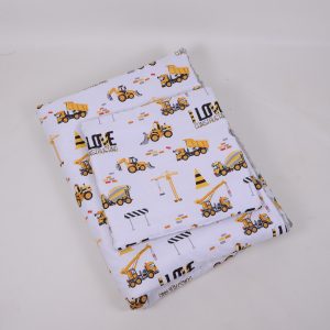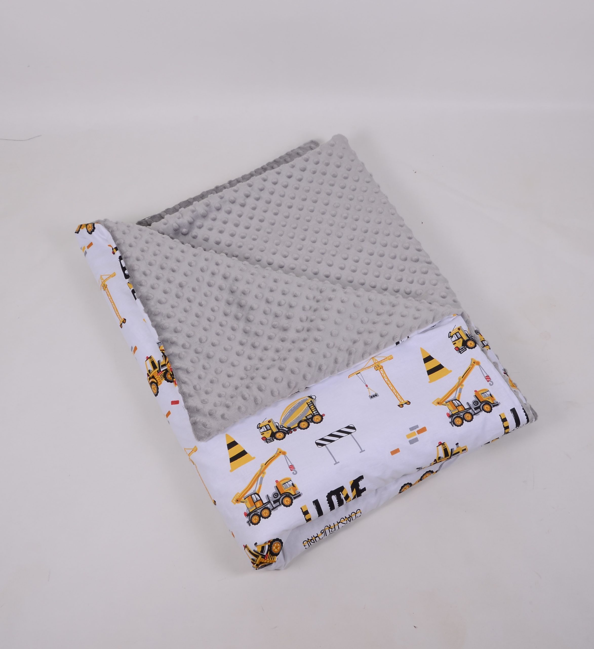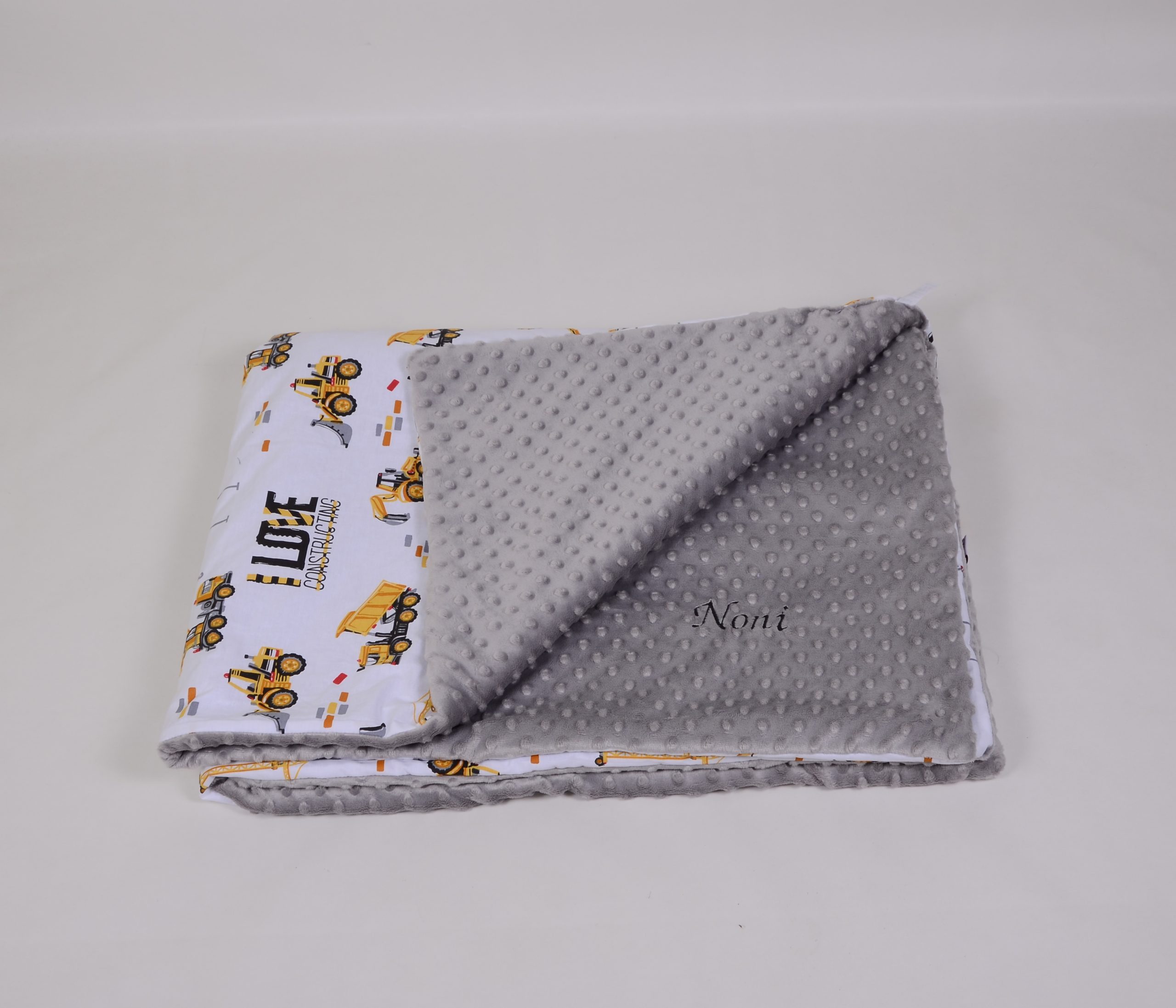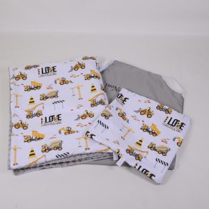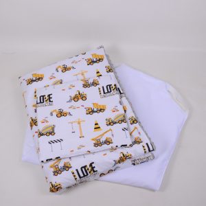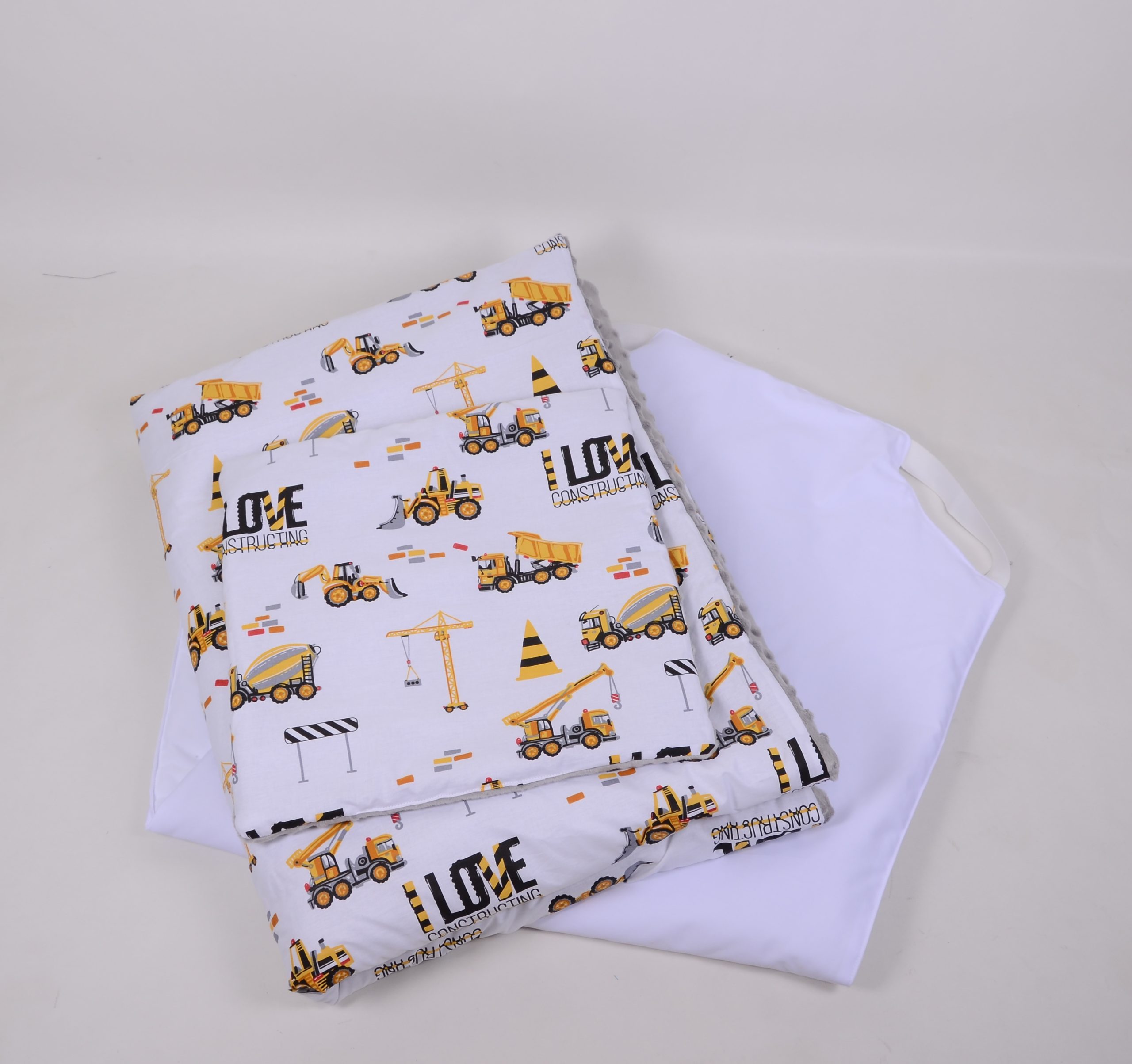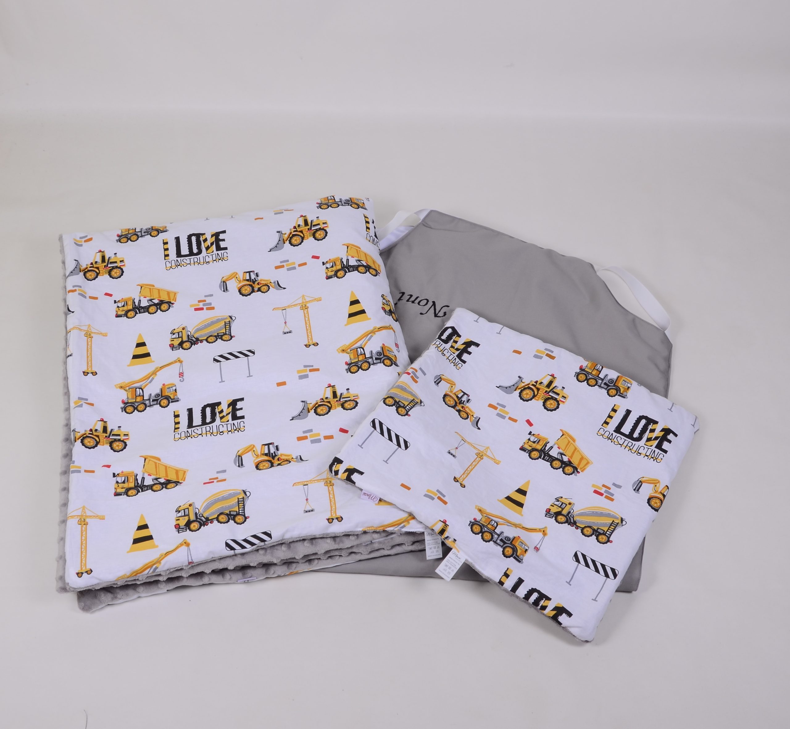A takaró egy oldal mintás pamutvászon, egy oldal puha minky/softtal és egy vlies béléssel készülnek. A 3 réteget összevarrjuk, így a bélés nem fog csúszkálni. A párna ugyanúgy készül, mint a takaró.