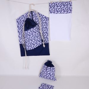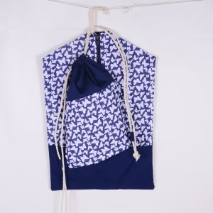 Húzózáras, pamutzsinórt teszünk bele. A mintás vászont egy erősebb egyszínű vászonnal párosítjuk, hogy a tartósabb legyen a zsák.