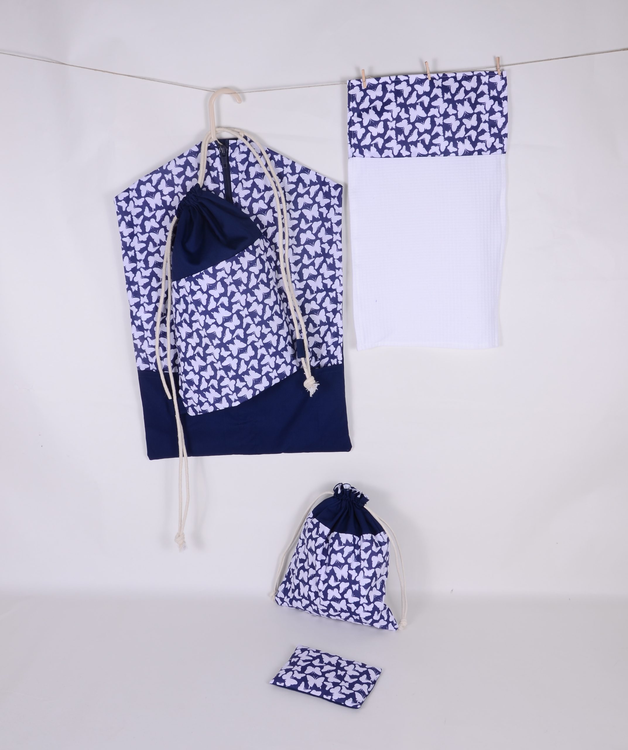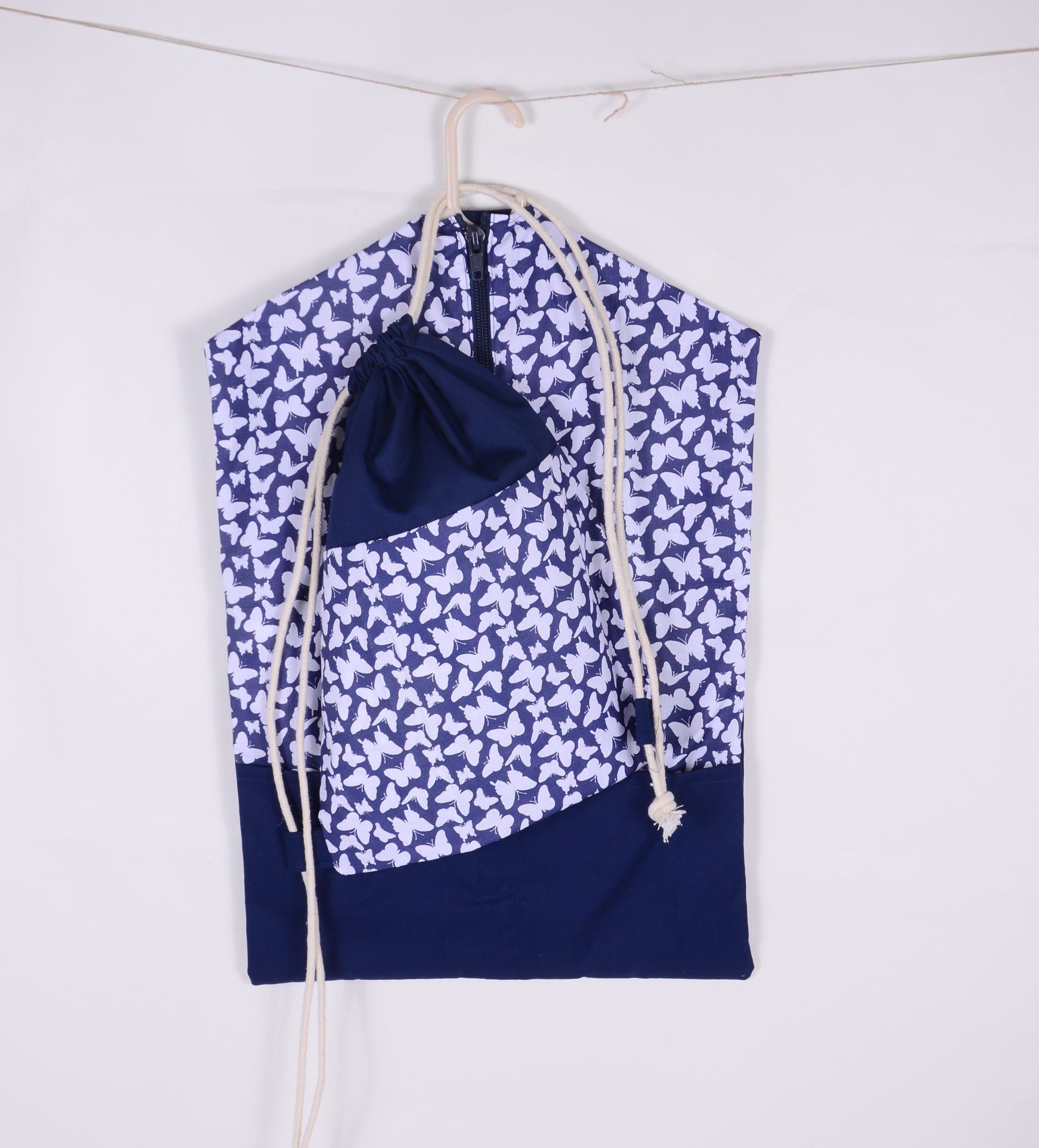 Vállfát adok hozzá. A mintás vászont egy erősebb egyszínű vászonnal párosítjuk, hogy a tartósabb legyen a zsák.