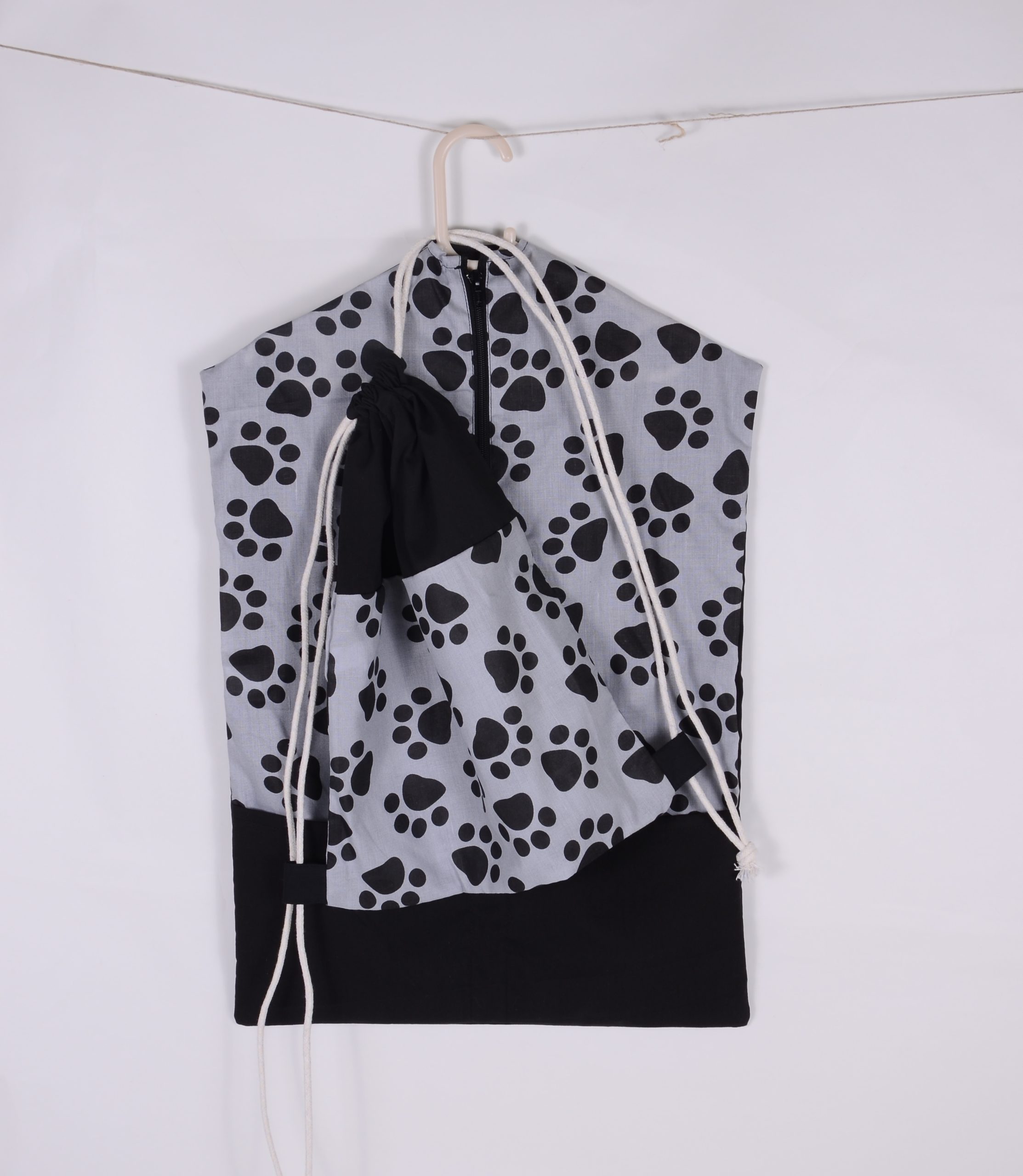 Húzózáras, pamutzsinórt teszünk bele. A mintás vászont egy erősebb egyszínű vászonnal párosítjuk, hogy a tartósabb legyen a zsák.