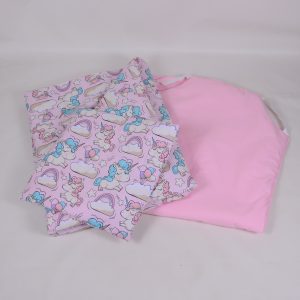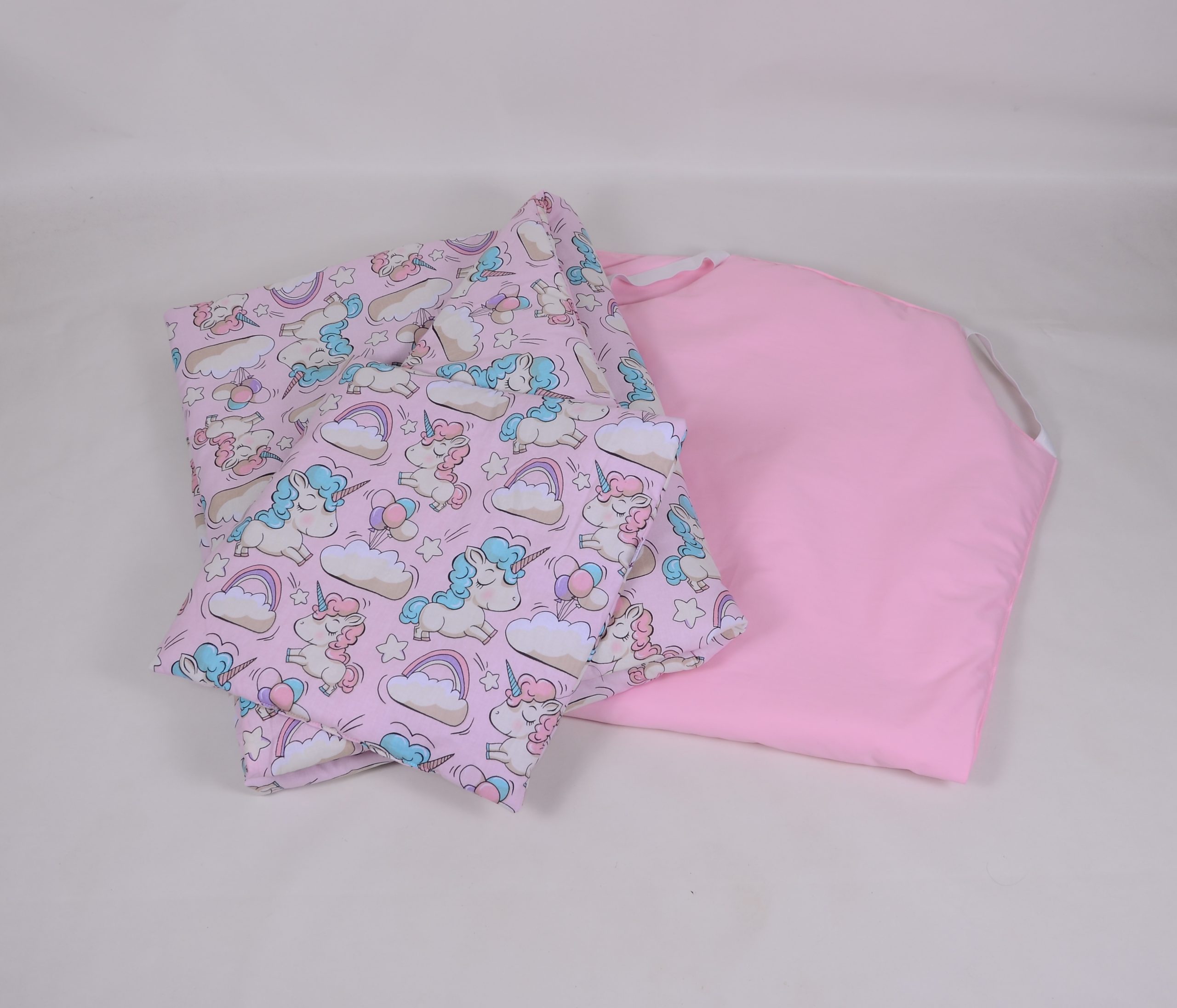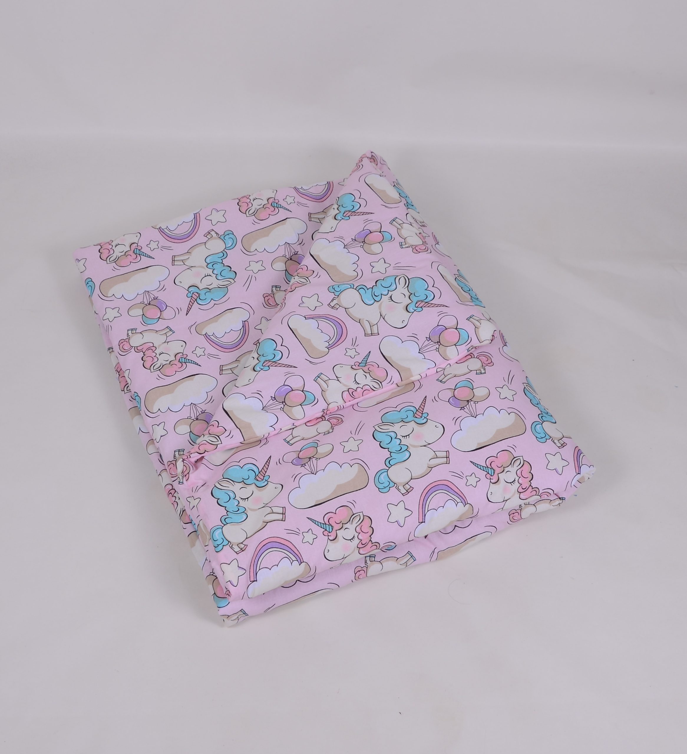 A takaró 2 oldala mintás pamutvászon, ebbe egy vlies bélés kerül. A párna ugyanúgy készül, mint a takaró. A 3 réteget összevarrjuk, így a bélés nem fog csúszkálni.